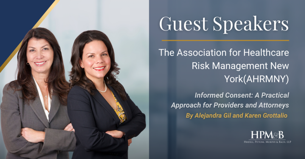 Attorneys Alejandra Gil and Karen Grottalio, recently served as guest speakers at the Association for Healthcare Risk Management of New York (AHRMNY) “We Are Safe Together” Half-Day Conference, held March 19 at the DeMatteis Center in Greenvale, New York.