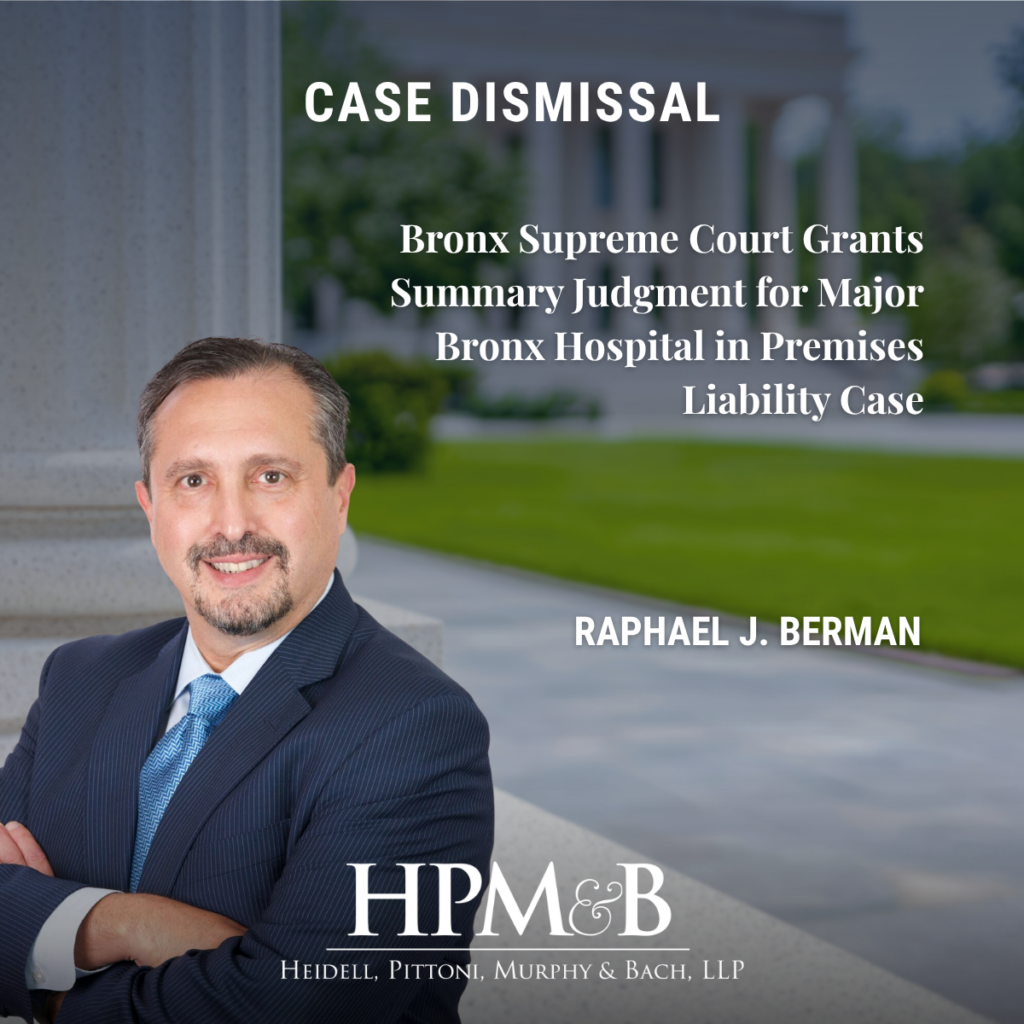 In a decision issued on April 7, 2026, Justice Guzman in Bronx County Supreme Court granted our summary judgment motion submitted on behalf of one of the largest hospitals in the Bronx area in a general liability case in which plaintiff claimed to have suffered injuries to her knees and back as a result of what she claimed was a defective “lip” in the top step of a stairwell at our facility.