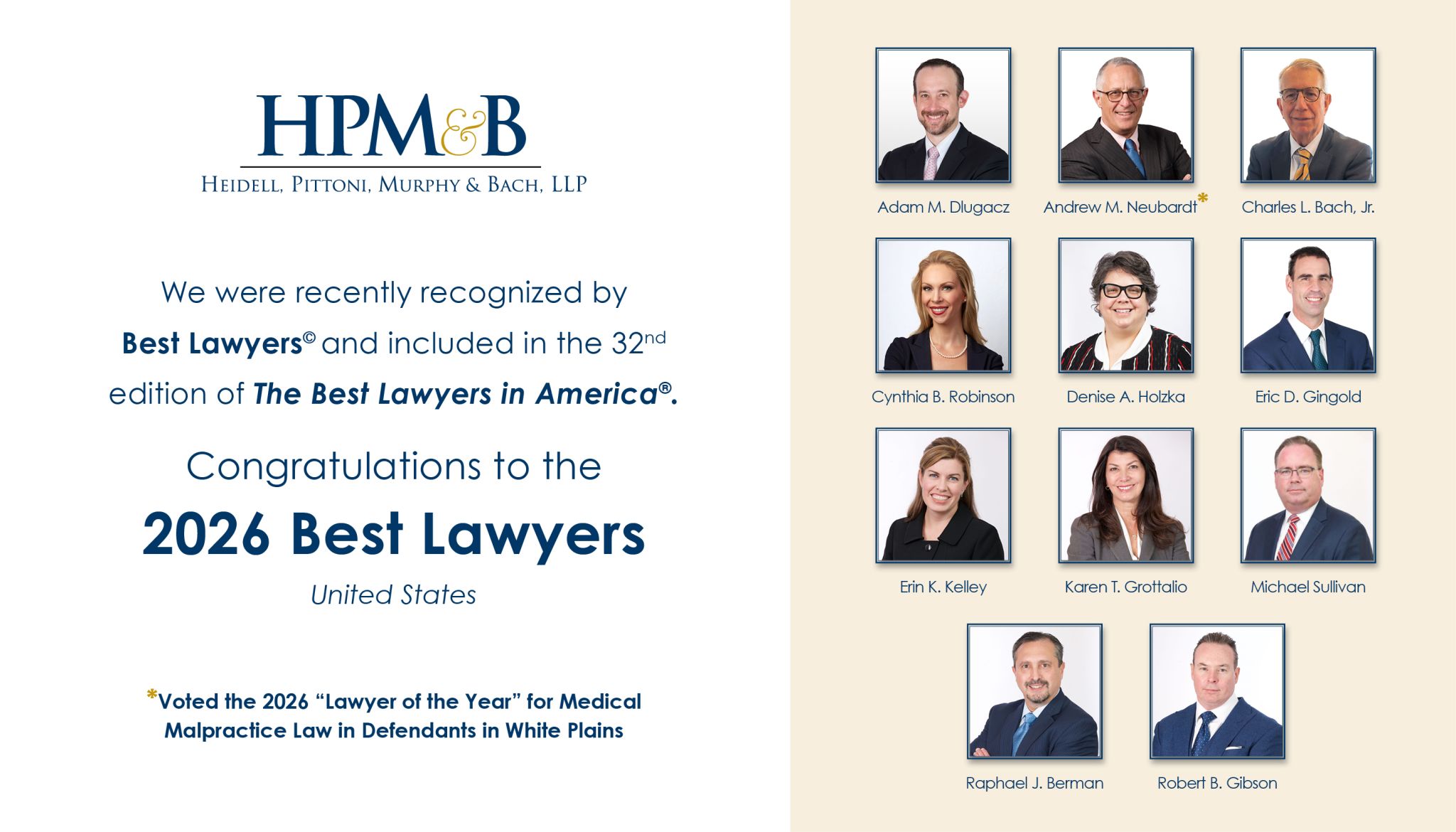 HPM&B is proud to announce that 11 of its attorneys have been recognized in the 32nd edition of The Best Lawyers in America® – 2026 Best Lawyers list for their excellence in Medical Malpractice Law – Defendants. Additionally, the firm congratulates Andrew M. Neubardt on being named the 2026 “Lawyer of the Year” in Medical Malpractice Law – Defendants in White Plains by the publication.
